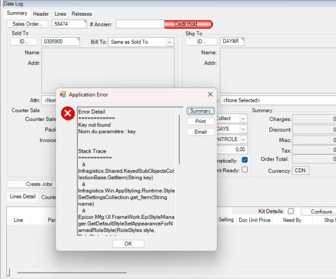 Après discussion avec Sacha de RDC et Dominic de chez ECS, il s’avère que le problème soit connu et provient du fait que lorsqu’un utilisateur laisse sa session de Vantage ouverte sur son poste et se connecte ensuite en RDP (Remote Desktop Protocol), aussitôt que l’on interroge la base de données, l’erreur survient et ce, indépendamment du module utilisé.